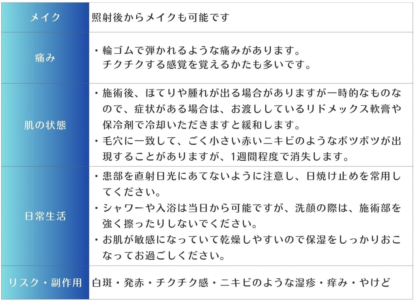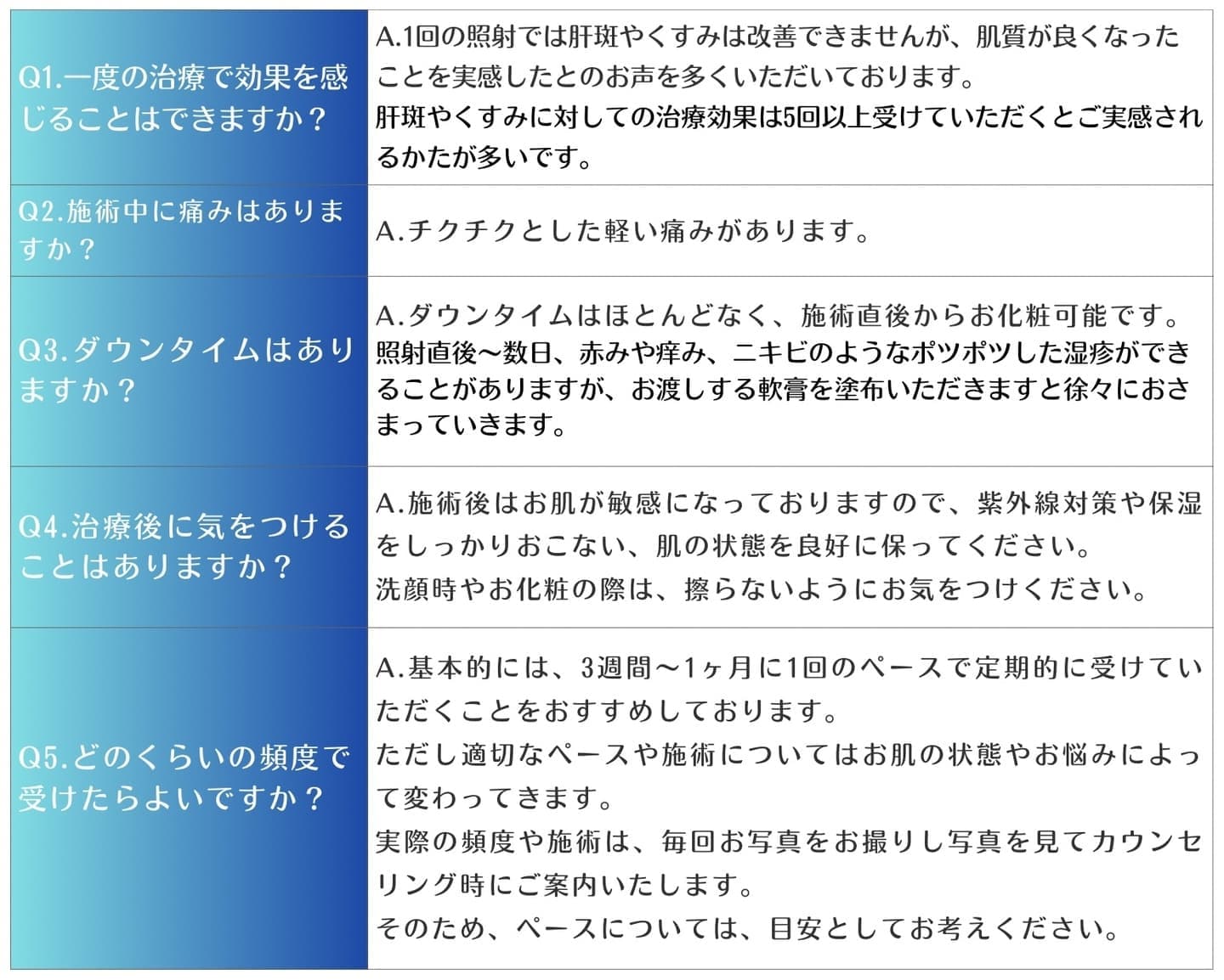また、衝撃波でメラニン色素を破壊することから、個人差はありますが、施術中の痛みや表面のダウンタイムもほとんどない治療です。