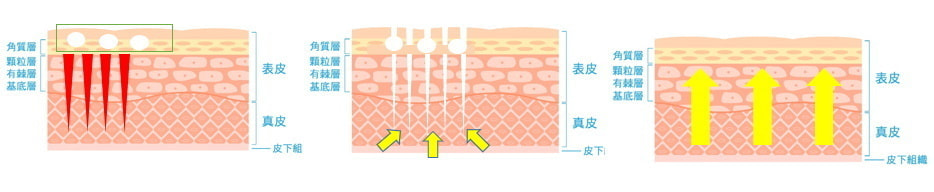 剣山のように細かいレーザーを照射すると、皮膚の内側に細かい孔があき、その孔があけられた皮膚組織が肌を再生するために、コラーゲンやエラスチンを増加させ、急激に新しい肌が作られていきます。