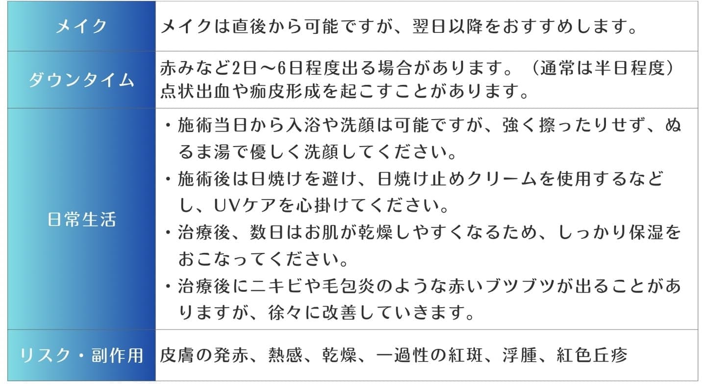 ピコフラクショナルでは表面を傷つけることなく真皮まで届くフラクショナル照射がおこなえるので、シミ治療と同時にシワやニキビ痕などの肌質改善治療も同日に可能です。CO2フラクショナルと比べると、ダウンタイムも少ないので、ダウンタイムが取れないかたにもおすすめの治療方法です。