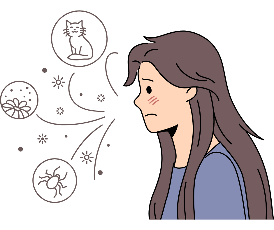 アレルギー性鼻炎は、ハウスダスト・花粉・ダニ・カビなどに対するアレルギー反応によって、鼻水・鼻づまり・くしゃみを引き起こす疾患です。
