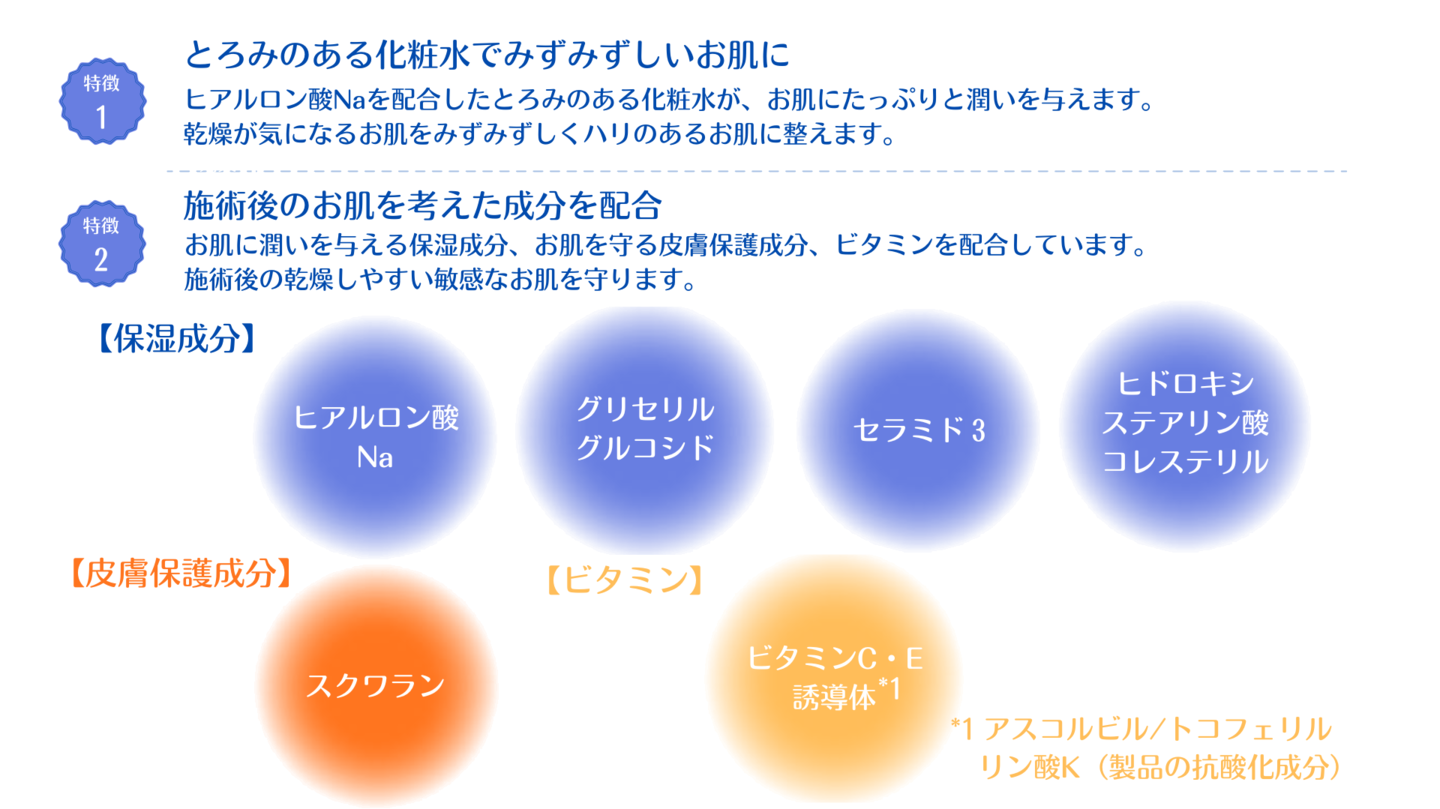 水、BG、グリセリン、ヒアルロン酸Na、グリセリルグルコシド、セラミド3、ヒドロキシステアリン酸コレステリル、スクワラン、グリチルリチン酸2K、(アスコルビル/トコフェリル)リン酸K、PEG-40水添ヒマシ油、エチルヘキサン酸セチル、ポリアクリル酸Na、フェノキシエタノール