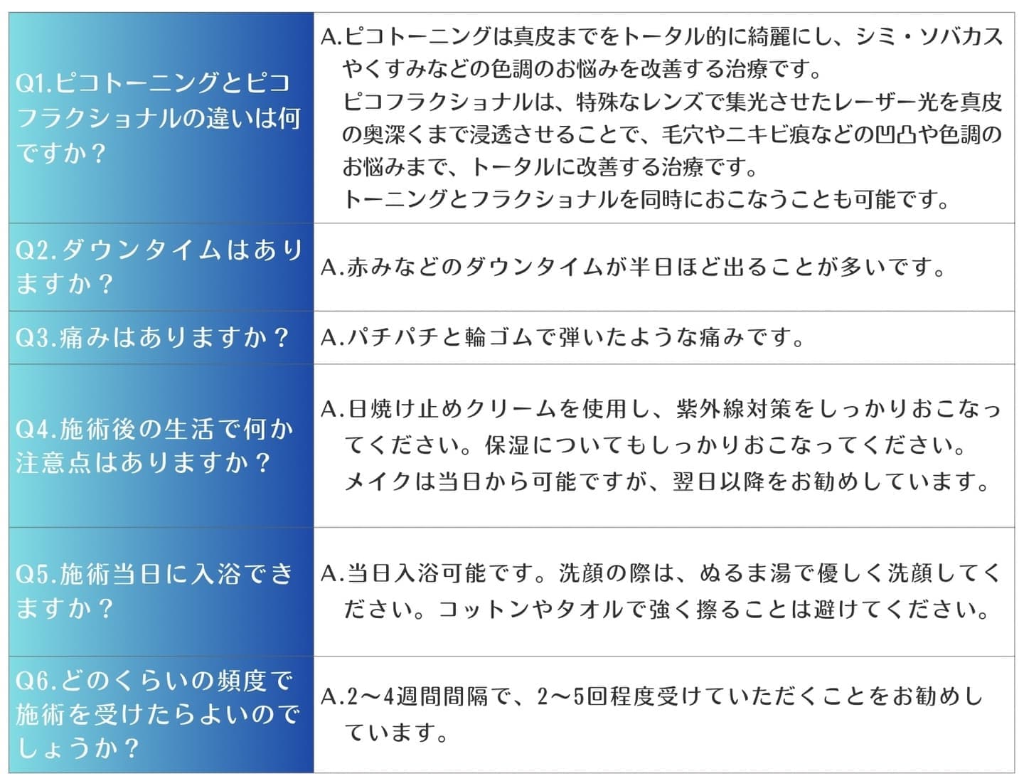 ピコフラクショナルでは表面を傷つけることなく真皮まで届くフラクショナル照射がおこなえるので、シミ治療と同時にシワやニキビ痕などの肌質改善治療も同日に可能です。CO2フラクショナルと比べると、ダウンタイムも少ないので、ダウンタイムが取れないかたにもおすすめの治療方法です。