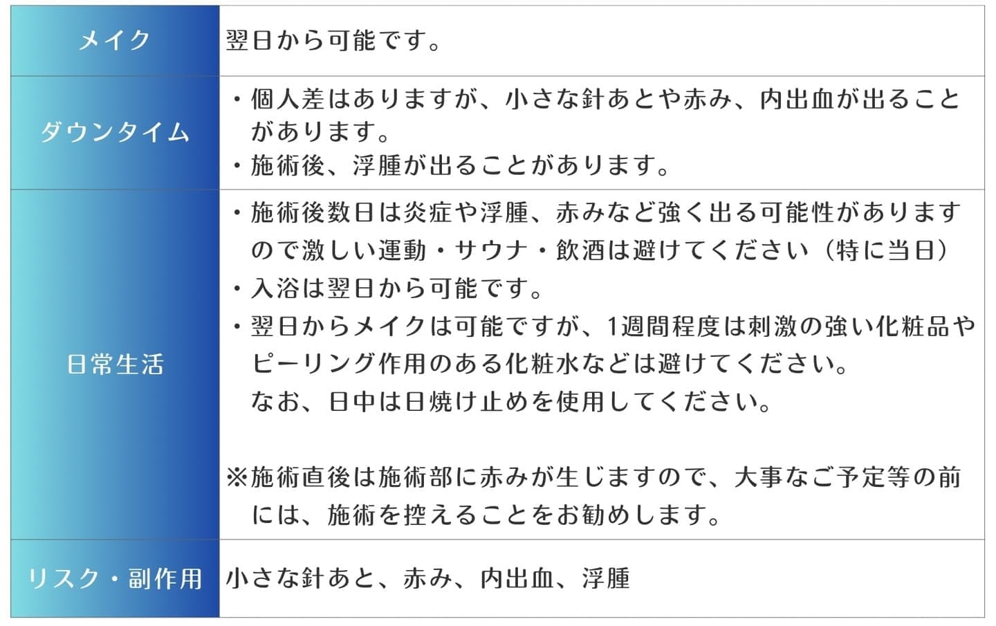 さらに、美容成分の効果だけでなく、注入の刺激で真皮のコラーゲン産生も促され、肌全体の若返りが期待できます。