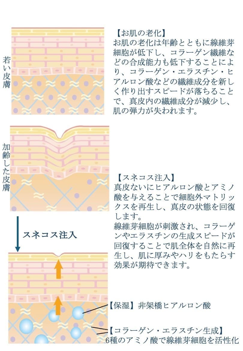 国際・国内特許を取得した特別な比率で配合した薬剤を、肌の真皮層へ注入することにより、「細胞外マトリックス(ECM)」が線維芽細胞を直接刺激し、新しく若い線維芽細胞やコラーゲンやエラスチンの生成が促進されることで、真皮の状態を改善します。