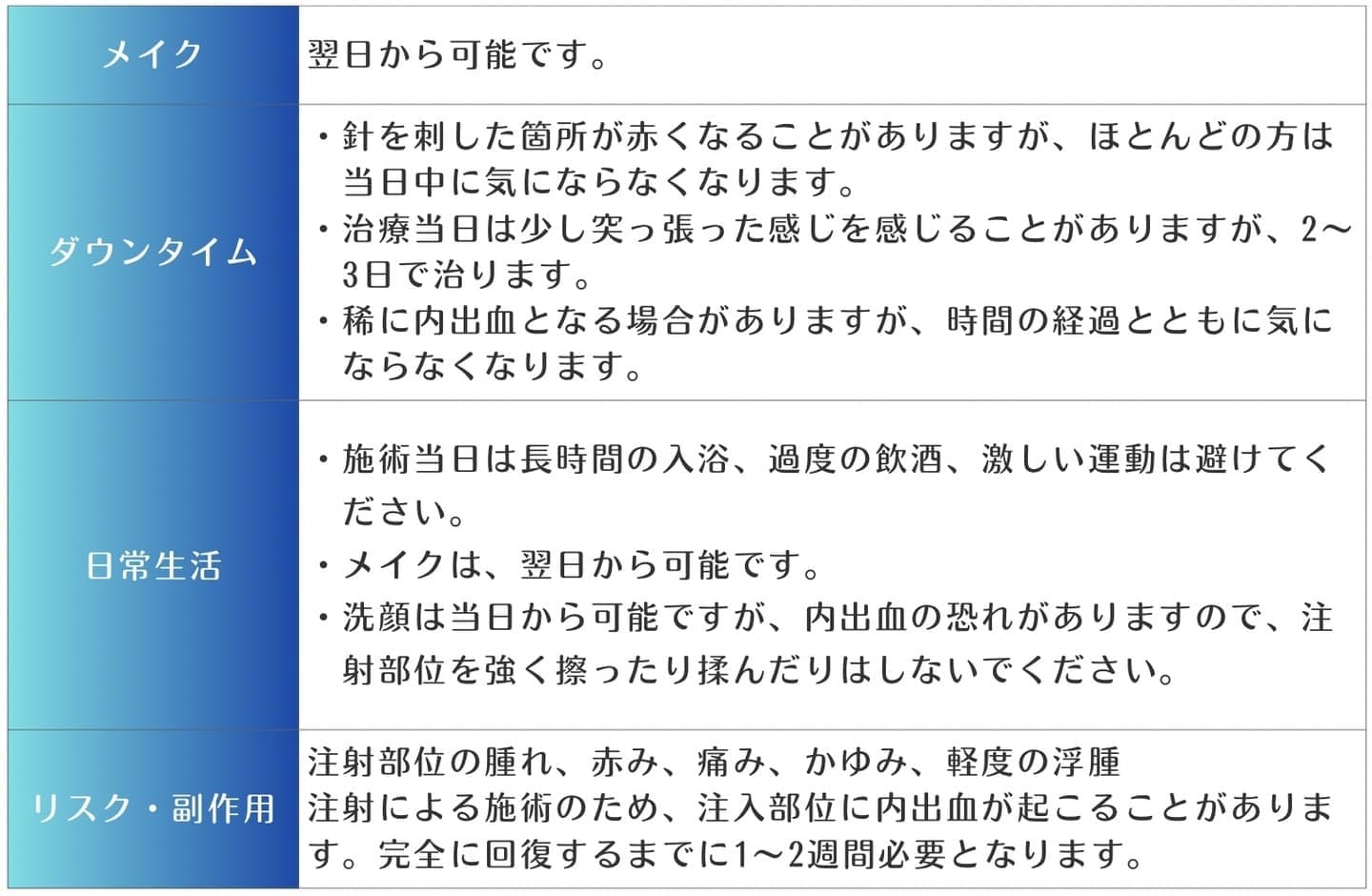さらっとしたテクスチャーでヒアルロン酸注射の合併症として起こりうる血管閉塞のリスクが極めて少ないのも特徴です。